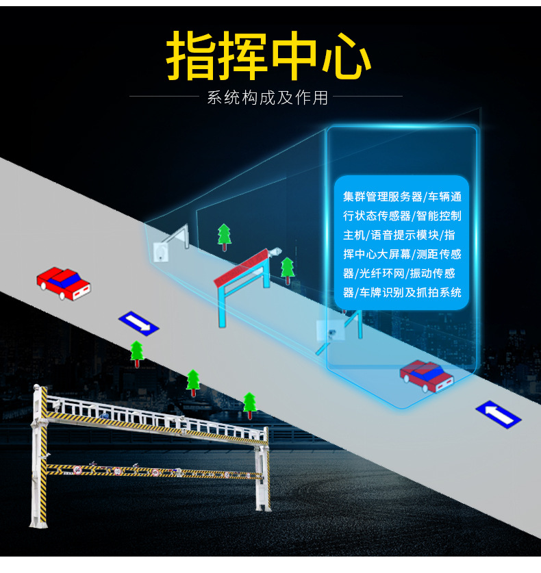• 集群管理功能:管理通行證系統數據;控制中心遠程布控車輛;指揮現場人員,勸 離違法司機; 通過集群組態管理,一臺電腦同時管理多個點位和幾百個門架 ;